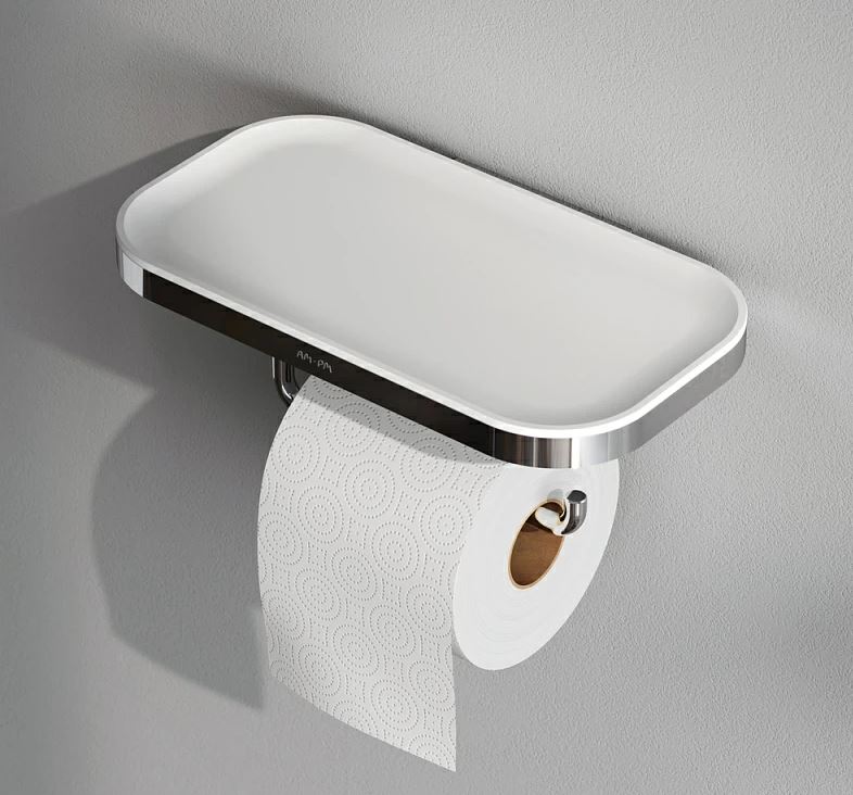 Обтекаемая форма продукта внешне напоминает современные смартфоны и повторяет линии других продуктов коллекции. Держатель оснащен удобной полочкой которую можно использовать для хранения необходимых мелочей.