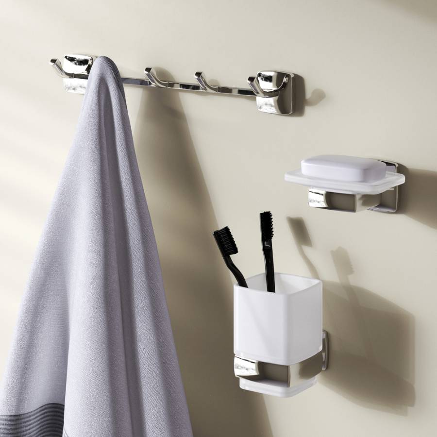 Занимая минимум места в пространстве аксессуары Gem помогут рационально организовать место для хранения и станут стильными акцентами в интерьере. В комплекте: стеклянная мыльница стеклянный стакан набор крючков для полотенец._x000D_