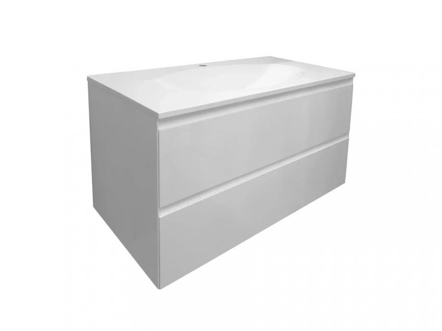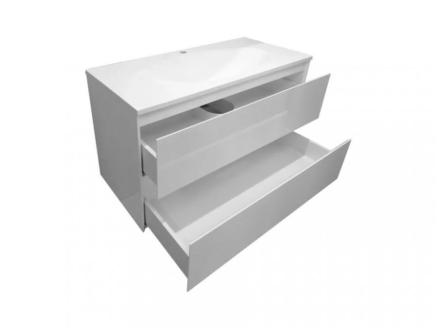 Подвесная тумба укомплектована прямоугольной раковиной из литьевого мрамора, плавно перетекающая в овальную чашу, которая добавляет изящность мебели и передает атмосферу стиля. В тумбе расположены 2 вместительных ящика, интегрированные ручки выполнены за счет скошенных фасадов. Мебель выполнена из влагостойкого ЛДСП и качественного MDF с использованием эмали RENNER (Италия). Ящики снабжены системой плавного закрывания. Для мебели используется фурнитура BLUM (Австрия).