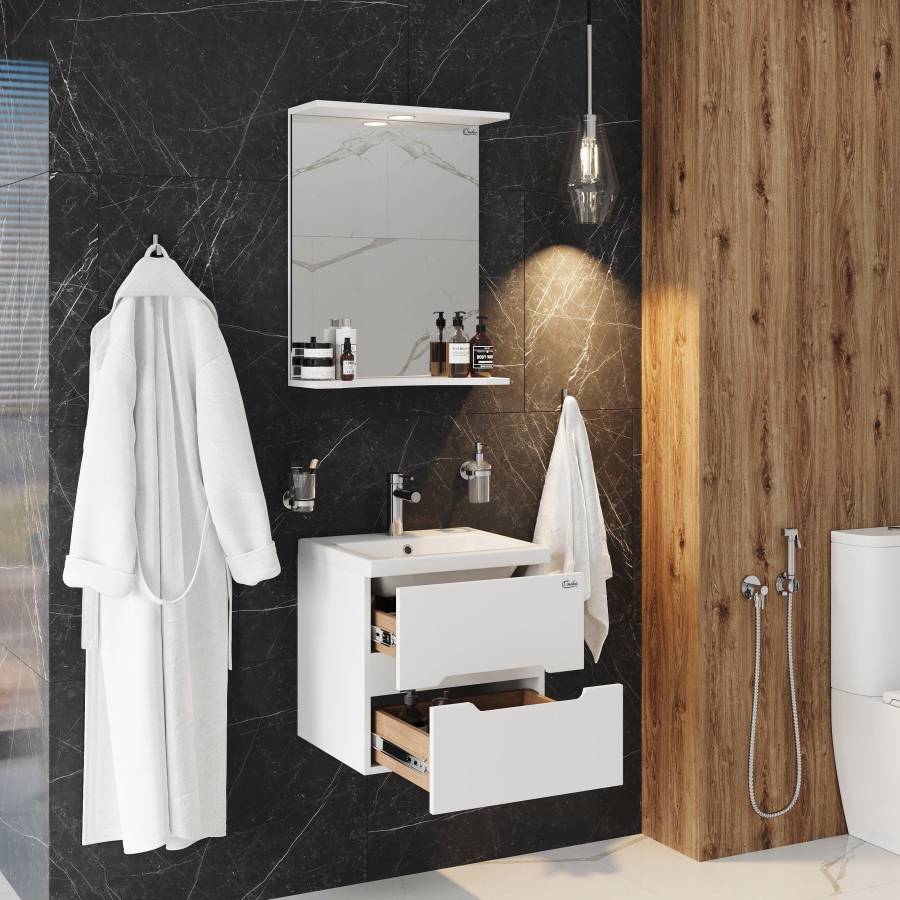 Корпус тумбы выполнен из ЛДСП, фасады ящиков - из ЛМДФ в пленке, устойчивых к механическим воздействиям, перепадам температур и высокой влажности. Тумба надежно крепится к стене и не занимает место на полу, не создавая при этом сложностей в уборке ванной комнаты.