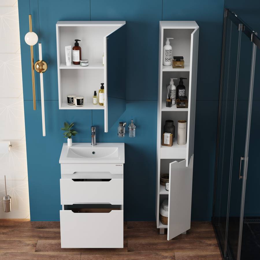 Тумба имеет два ящика с направляющими полного выдвижения: нижний предназначен для больших предметов, а верхний, имеющий удобную систему организации пространства, - для мелких аксессуаров. Ручки, изящно интегрированные в фасады, позволяют сделать эксплуатацию мебели более удобной и практичной.