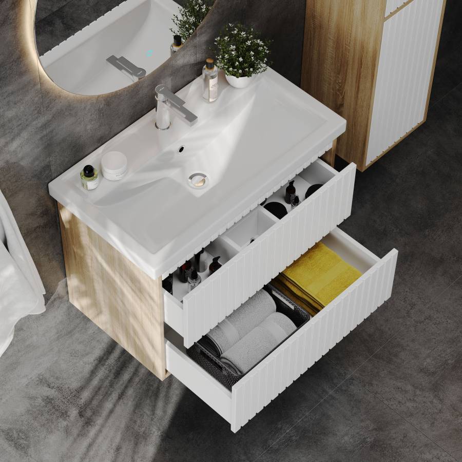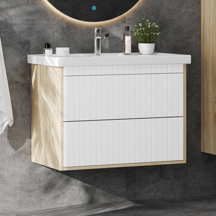 Подвесная конструкция тумбы создает ощущение легкости, не создает неудобств при уборке помещения и визуально расширяет пространство.