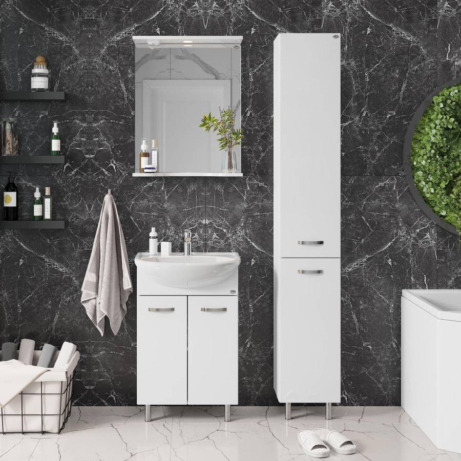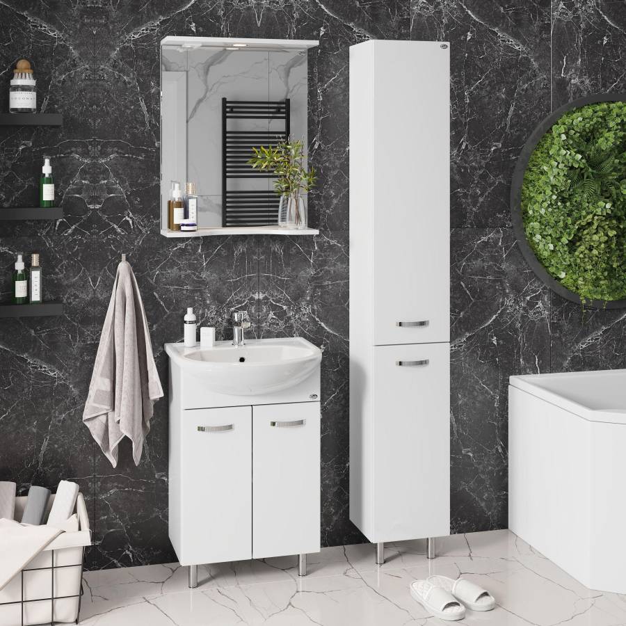 Строгие формы без декора и стильные хромированные ручки на двух распашных дверях, скрывают просторное внутреннее пространство с полкой для размещения необходимых бытовых принадлежностей.