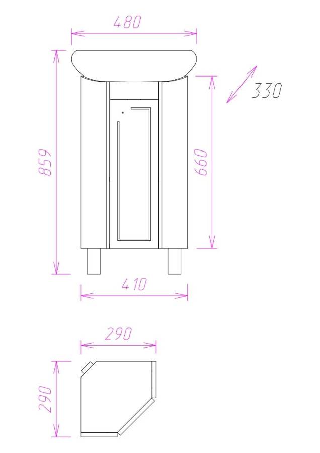 Размеры тумбы без учета раковины и ножек 41х28х66 см.