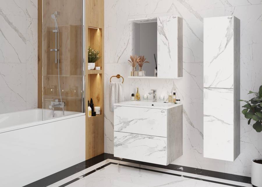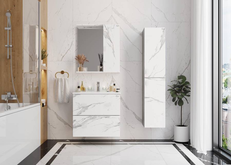 Белые матовые ручки практически не заметны на фасаде и не отвлекают взгляд от текстуры мрамора.
