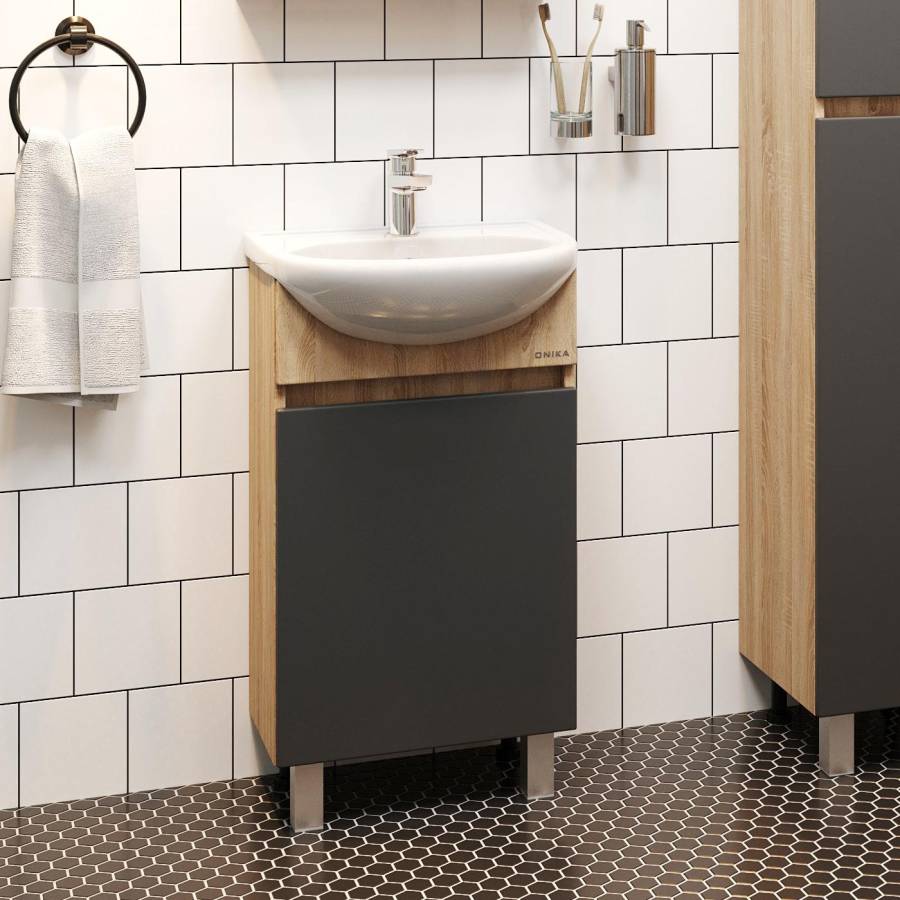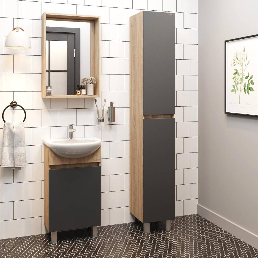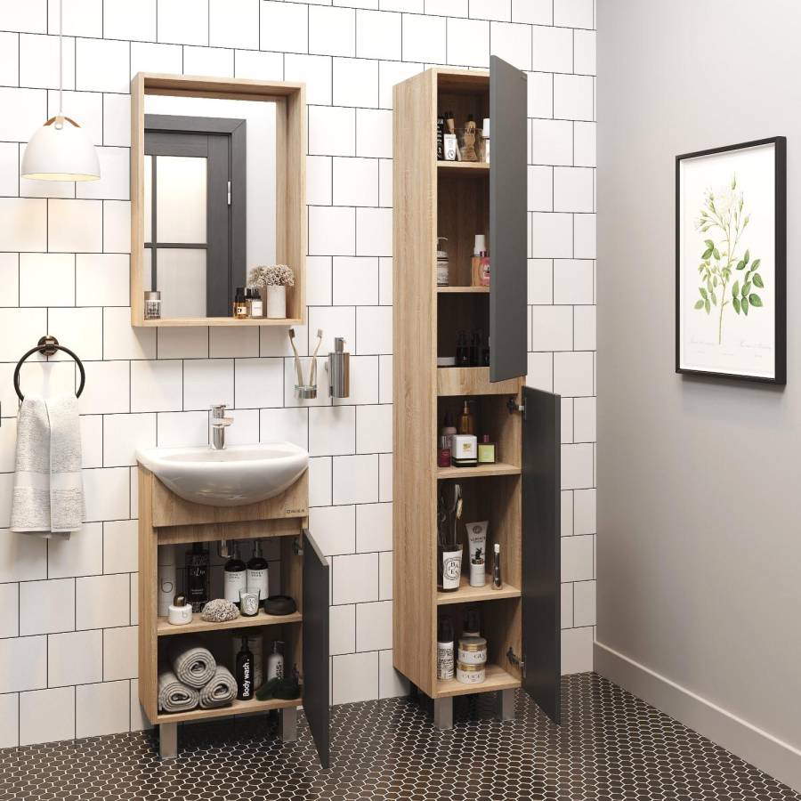 Тумба сочетает в себе красоту и функциональность: серый матовый фасад с покрытием SoftTouch, корпус цвета дуб сонома с роскошной текстурой, строгие формы без декора. За дверцей с интегрированной ручкой скрывается пространство с полкой для размещения необходимых бытовых принадлежностей.