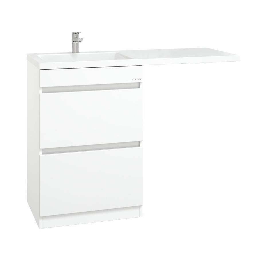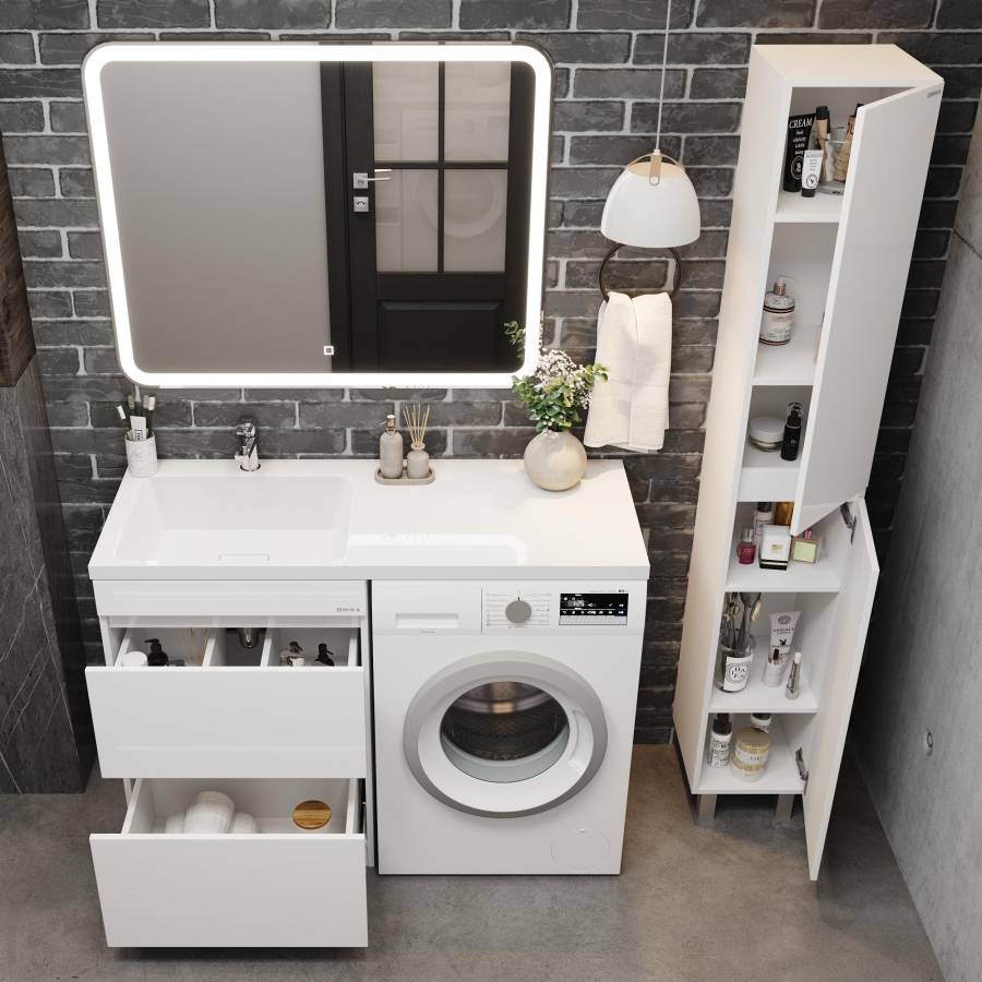 Тумба имеет белый глянцевый фасад, строгие формы без декора, удобные интегрированные ручки и два ящика с направляющими полного выдвижения: нижний предназначен для больших предметов, а верхний, имеющий удобную систему организации пространства, - для мелких аксессуаров.