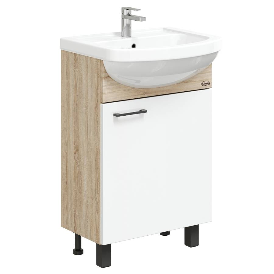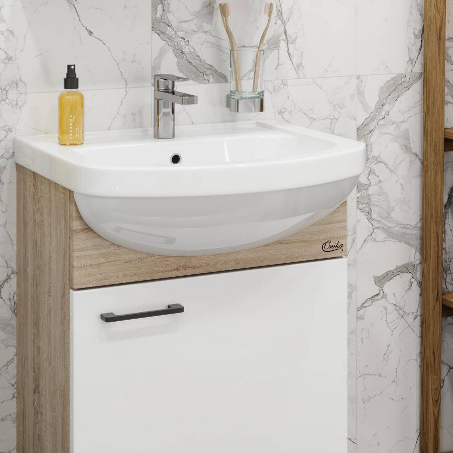 Компактные габариты позволяют грамотно организовать небольшой санузел, а белый фасад и корпус цвета дуба гармонично сочетаются с черной фурнитурой и отлично впишутся в интерьер любой ванной комнаты.