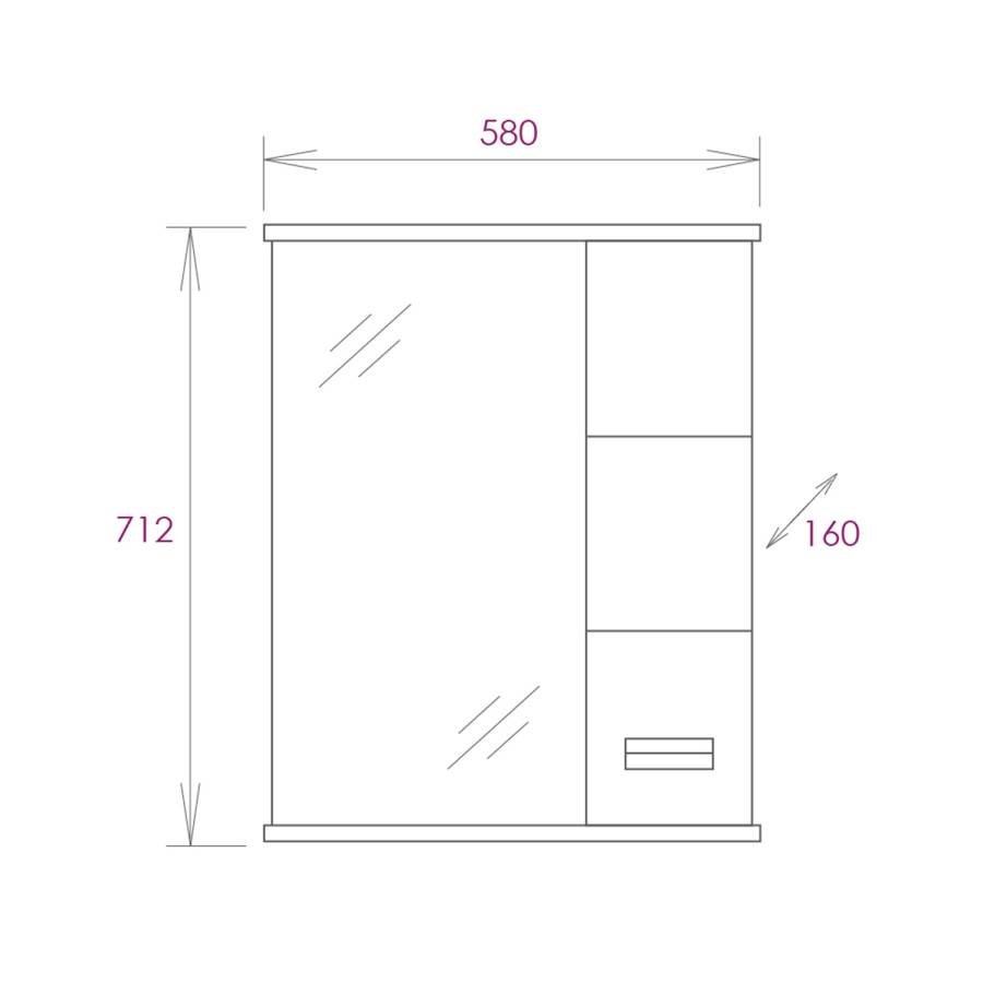 Справа от зеркала за распашной дверцей с механизмом плавного закрывания расположено отделение для хранения, разделенное на две части горизонтальной полочкой, под зеркалом - открытая полочка для косметических средств или декоративных элементов.
