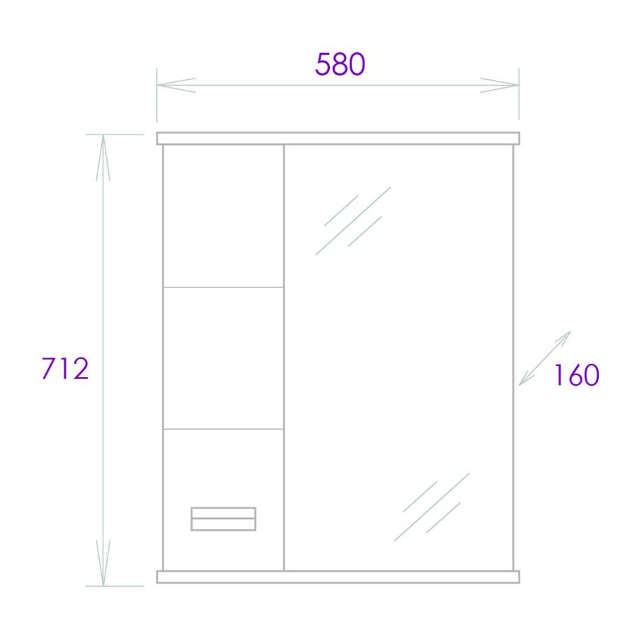 Слева от зеркала за распашной дверцей с механизмом плавного закрывания расположено отделение для хранения, разделенное на две части горизонтальной полочкой, под зеркалом - открытая полочка для косметических средств или декоративных элементов.