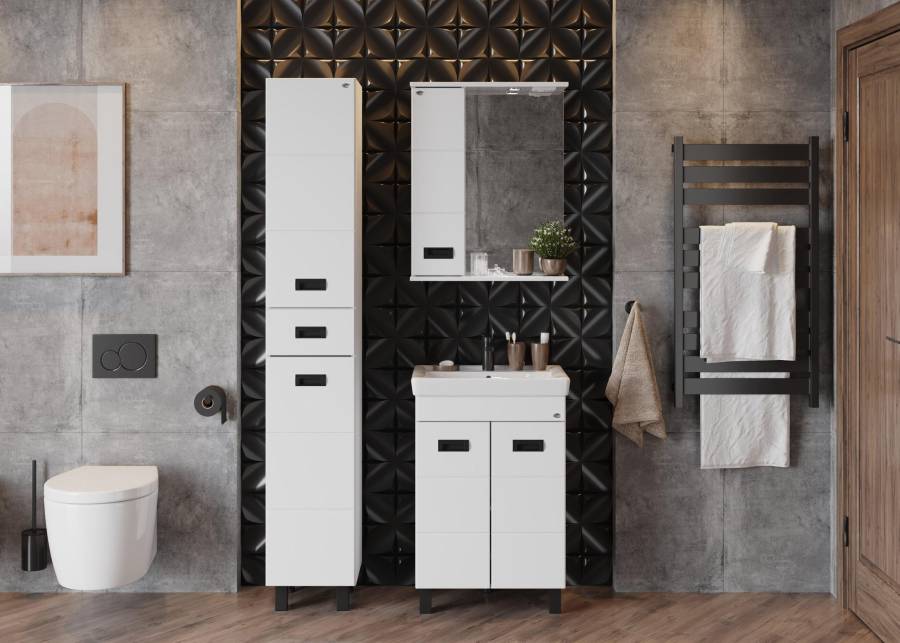 Глянцевый белый цвет фасада контрастирует с черной матовой фурнитурой, а ненавязчивая горизонтальная фрезеровка дополняет образ стильной и современной мебели.