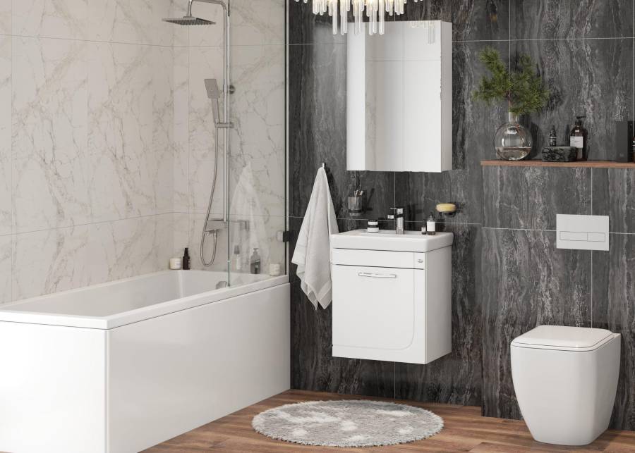Простая прямоугольная форма, полное отсутствие декора и зеркальный фасад - идеальное решение для дизайна ванной комнаты в аскетичном стиле.