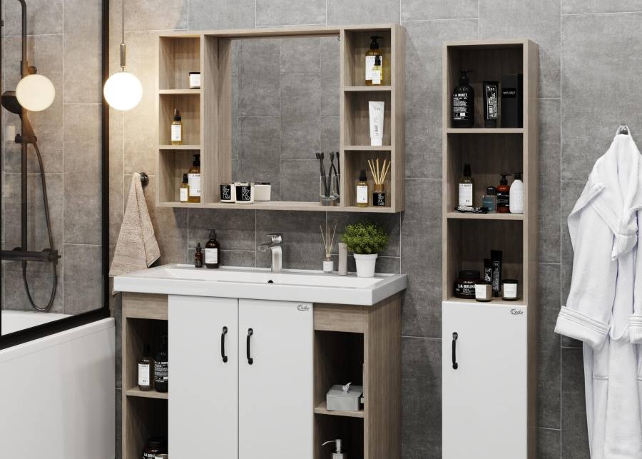 6 открытых полок по бокам от зеркала обеспечивают быстрый доступ к часто используемым аксессуарам, место под зеркалом создано для косметических средств или декоративных элементов.