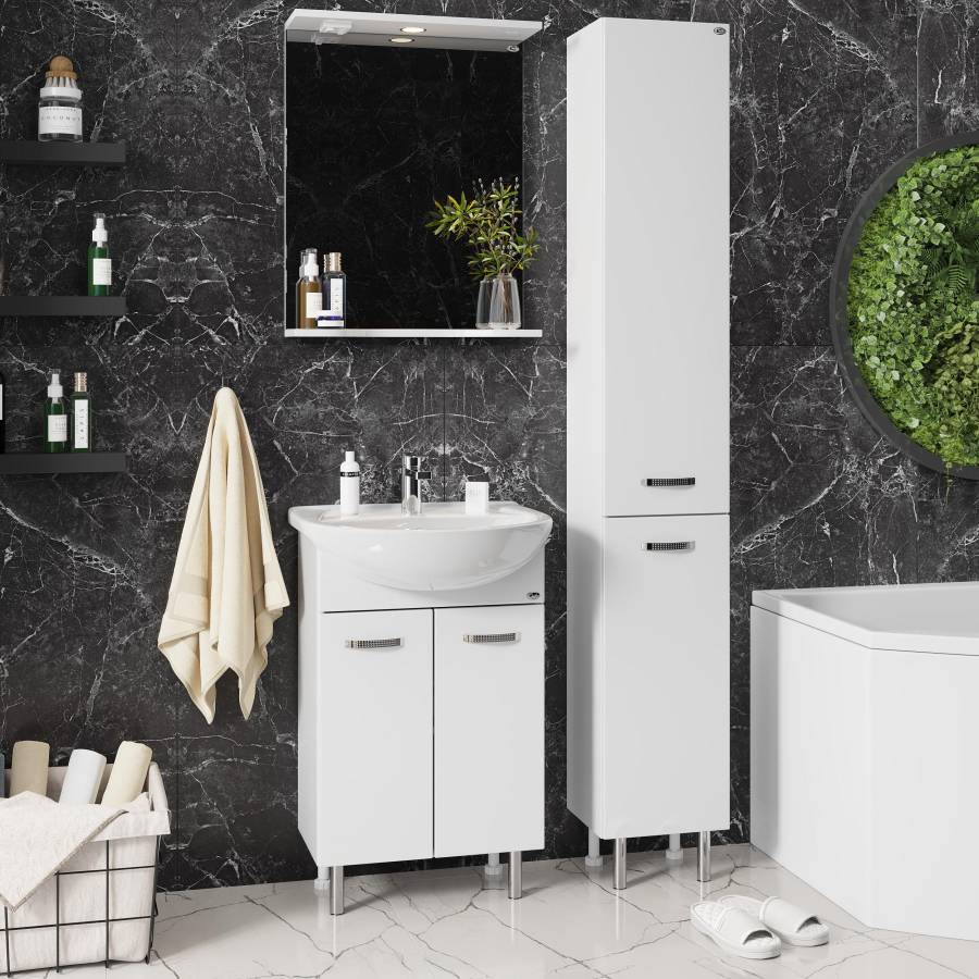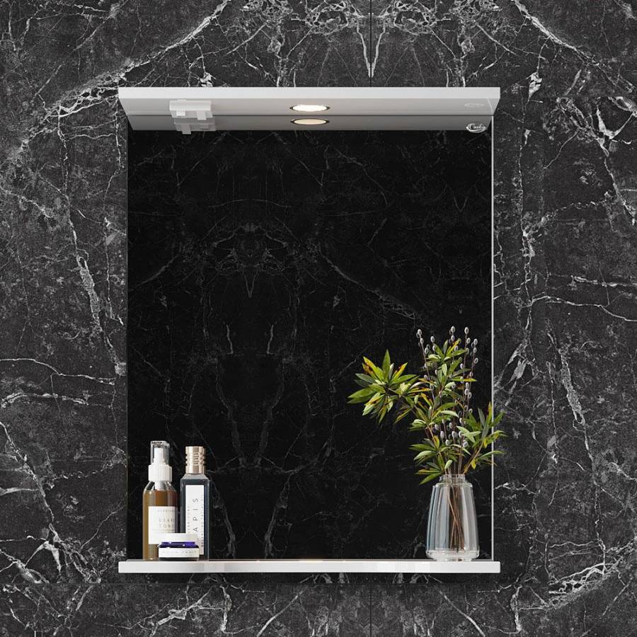 Основа для зеркала выполнена из ЛДСП, полка и козырек - из МДФ в пленке, устойчивых к механическим воздействиям, перепадам температур и высокой влажности.
