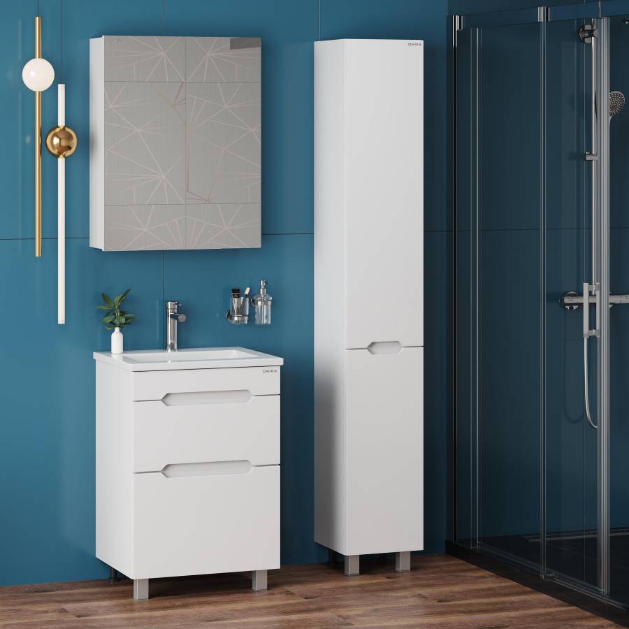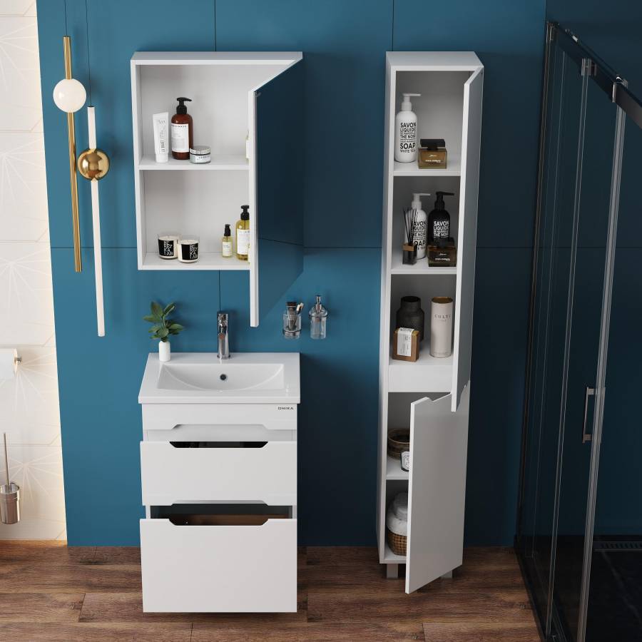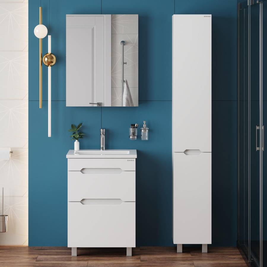Пенал имеет два отделения за распашными дверцами с доводчиками, полки внутри регулируются по высоте. Ручки, изящно интегрированные в фасады, позволяют сделать эксплуатацию мебели более удобной и практичной.