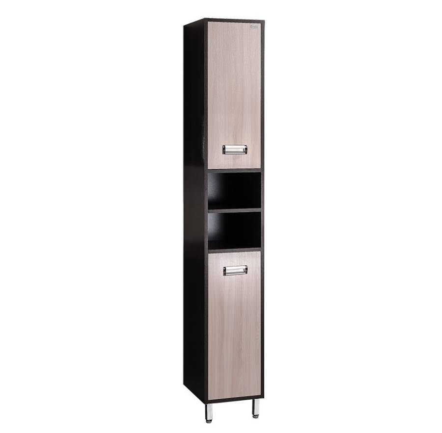 Посередине пенала - 2 открытые полки, сверху и снизу за распашными дверцами с врезными хромированными ручками и механизмом плавного закрывания скрывается просторное внутреннее пространство, разделенное горизонтальными полочками.