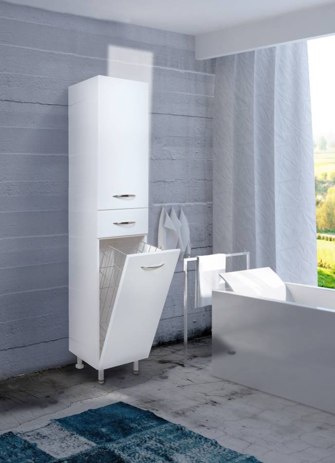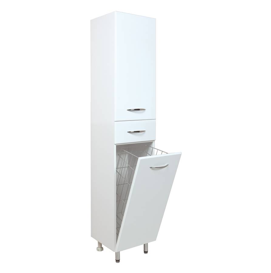Большое отделение сверху за распашной дверцей с механизмом плавного закрывания, небольшой ящик с направляющими полного выдвижения посередине и отделение с корзиной для белья внизу шкафа обеспечит бережное хранение всех необходимых в ванной комнате вещей. Размер бельевой корзины: 180*240*650.