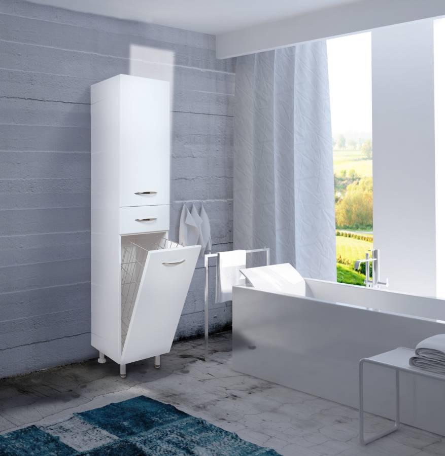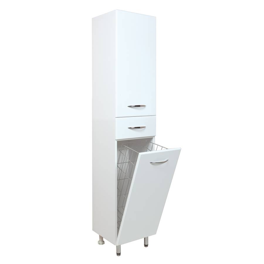 Большое отделение сверху за распашной дверцей с механизмом плавного закрывания, небольшой ящик с направляющими полного выдвижения посередине и отделение с корзиной для белья внизу шкафа обеспечит бережное хранение всех необходимых в ванной комнате вещей. Размер бельевой корзины: 250*265*640.