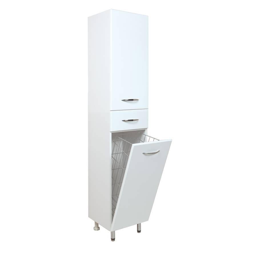 Большое отделение сверху за распашной дверцей с механизмом плавного закрывания, небольшой ящик с направляющими полного выдвижения посередине и отделение с корзиной для белья внизу шкафа обеспечит бережное хранение всех необходимых в ванной комнате вещей. Размер бельевой корзины: 270*370*630.