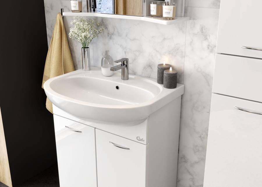 Две распашные дверцы с системой плавного закрывания и элегантными круглыми ручками скрывают вместительное пространство для хранения, разделенное полкой, которое позволяет компактно разместить бытовые принадлежности.