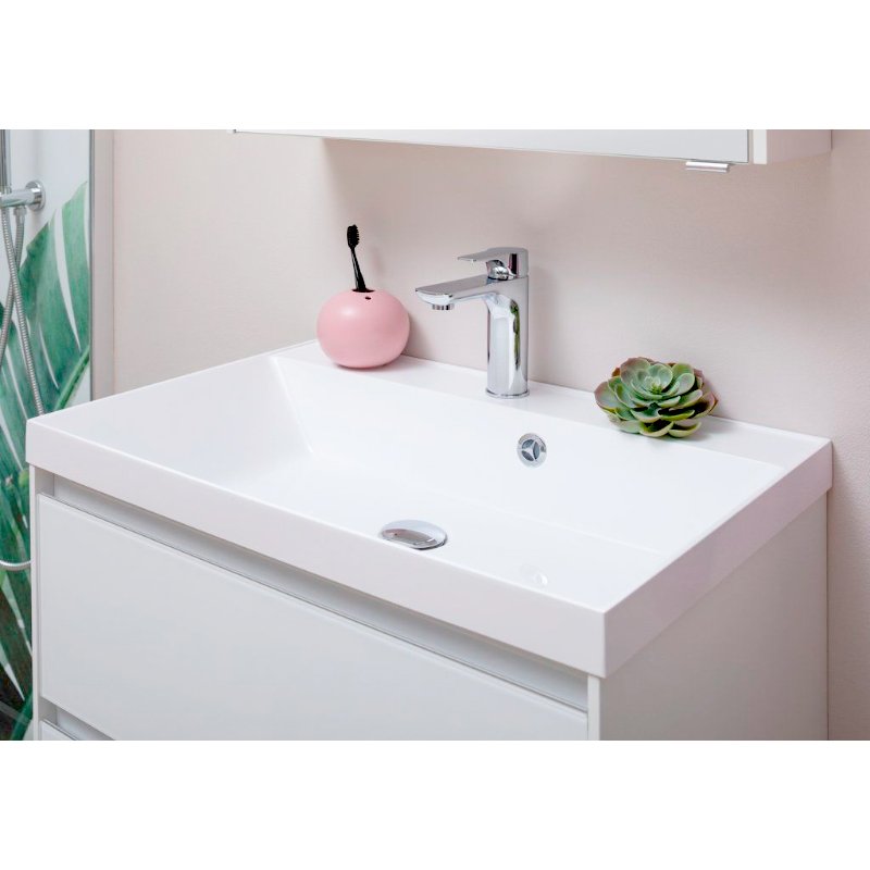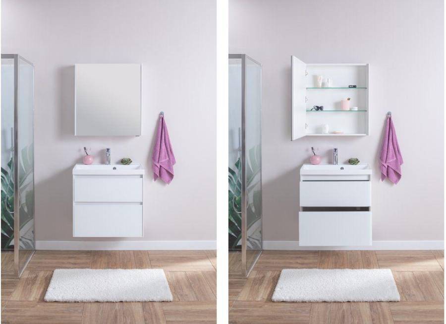 Производители позаботились о деталях. Ящики лишены выступающих деталей, ручки интегрированы в фасад. Тумбу можно из подвесного элемента преобразовать в напольный, просто докупив универсальные ножки. Раковина из литьевого мрамора «Орлеан» относится к числу накладных моделей и внешне выглядит как единое целое с тумбой. Ящики тумб оснащены направляющими Hettich Quadro c плавным закрыванием, более известным нам как доводчик.