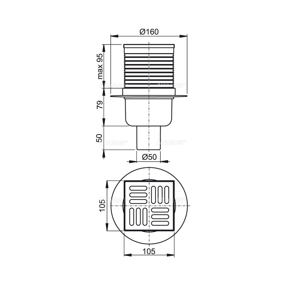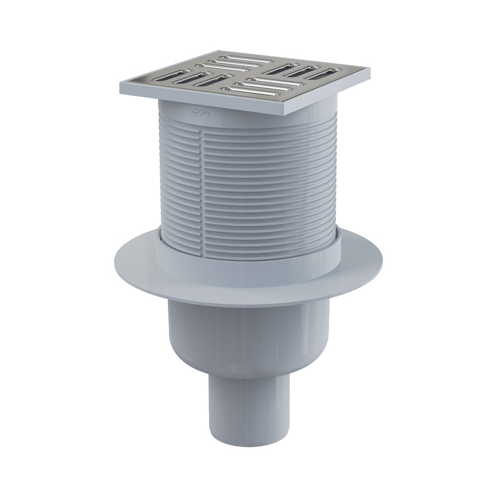 Корпус сливного трапа с прямым подключением к стоку Ø50 мм; Горловина сливного трапа 105×105 мм; Решетка из нержавеющей стали; Гидрозатвор – мокрый; Комплект прокладок. |