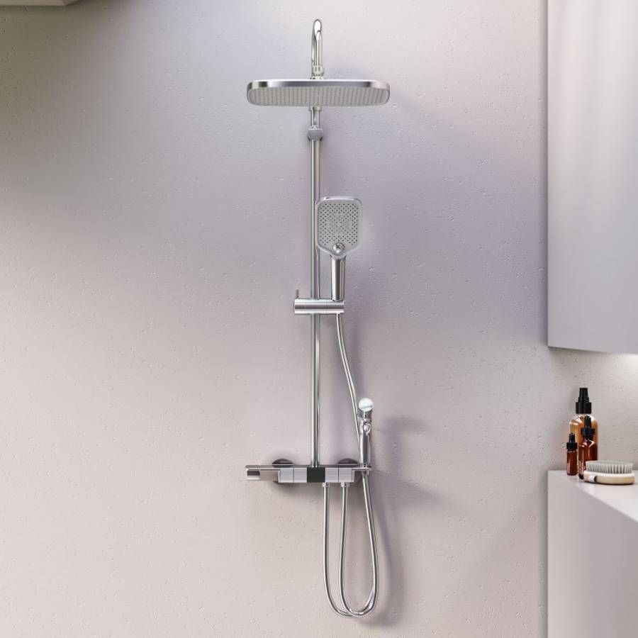 Максимальная безопасность и технологичность: термостатический картридж 35 мм обеспечивает точную настройку температуры и напора воды. Душевая система оснащена автоматическим дисплеем отражающим температуру воды в реальном времени. Непревзойдённый комфорт и удобство: тонкий латунный корпус выполнен в виде компактной полочки где вы можете хранить все необходимые вещи. БлагоДаря телескопической штанге с диапазоном регулировки в 400 мм водные процедуры будут одинаково комфортны абсолютно для всех членов семьи.