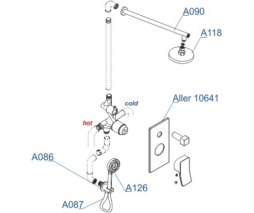 Смеситель для ванны и душа Aller 10641, Подключение шланга A086, Шланг для душа 1500 мм А087, Верхняя душевая насадка A118, Верхний излив для душа A090, Лейка 3-функциональная A126 |
