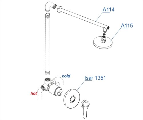 Смеситель для душа Isar 1351, Верхняя душевая насадка A115, Верхний излив для душа A114 |