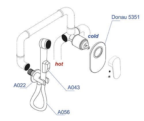 Смеситель для душа Donau 5351, Подключение шланга A022, Шланг для душа 1000 мм А056, Гигиеническая лейка с фиксатором A043 |