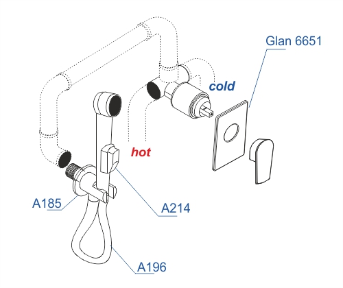 Смеситель для душа Glan 6651, Подключение шланга A185, Шланг для душа 1500 мм A196, Гигиеническая лейка с фиксатором A214 |