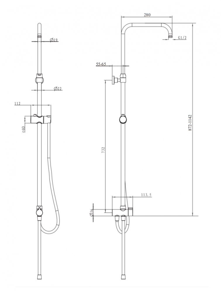 душевая стойка с переключателем и кронштейном для монтажа верхнего душа;