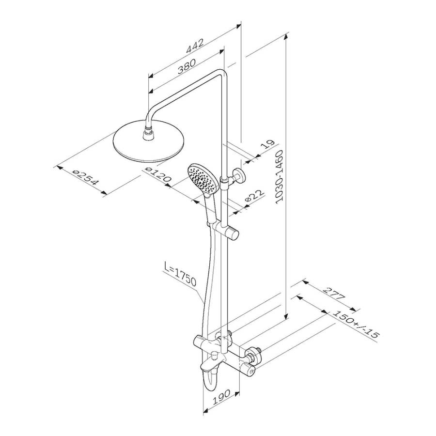 Продуманные детали для удобства использования: штанга регулируется по высоте в диапазоне от 1030 до 1460 мм обеспечивая комфорт для людей любого роста шаровый шарнир в держателе верхнего душа позволяет регулировать угол его наклона душевой шланг 1750 мм верхний душ диаметром 254 мм ручной душ диаметром 120 мм.