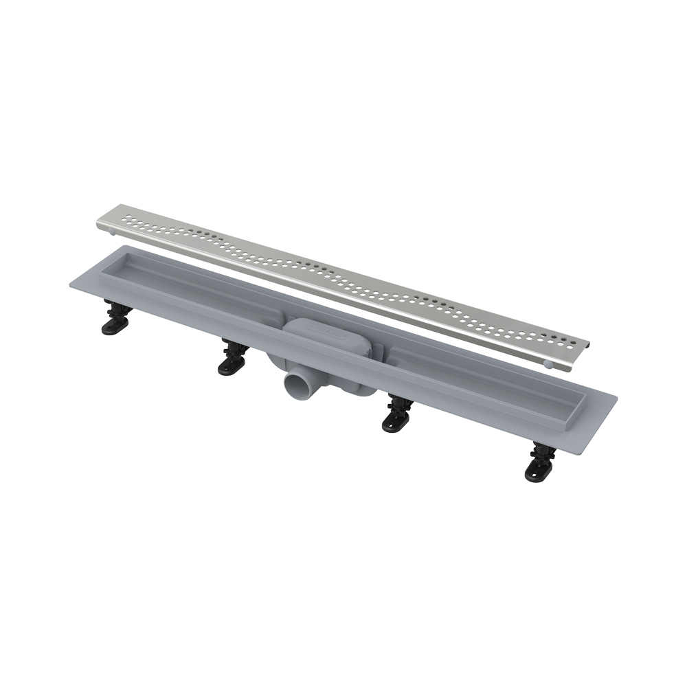 Водоотводящий желоб; Монтажный набор: -шуруп Ø4,2×38 – 8 шт., -дюбель Ø8 – 8 шт.; Самоклеящиеся гидроизоляционные ленты; Защитная пленка решетки; Крюк для демонтажа; Перфорированная решетка из нержавеющей стали Simple; 8 матового цвета в охранной пленке; Монтажный набор для крепления регулируемых ножек: -шуруп 4,2×9,5 – 8 шт.; Комбинированный гидрозатвор; Регулируемые ножки 4 шт. |