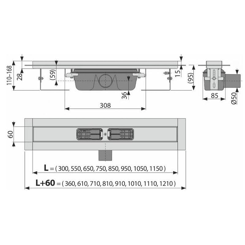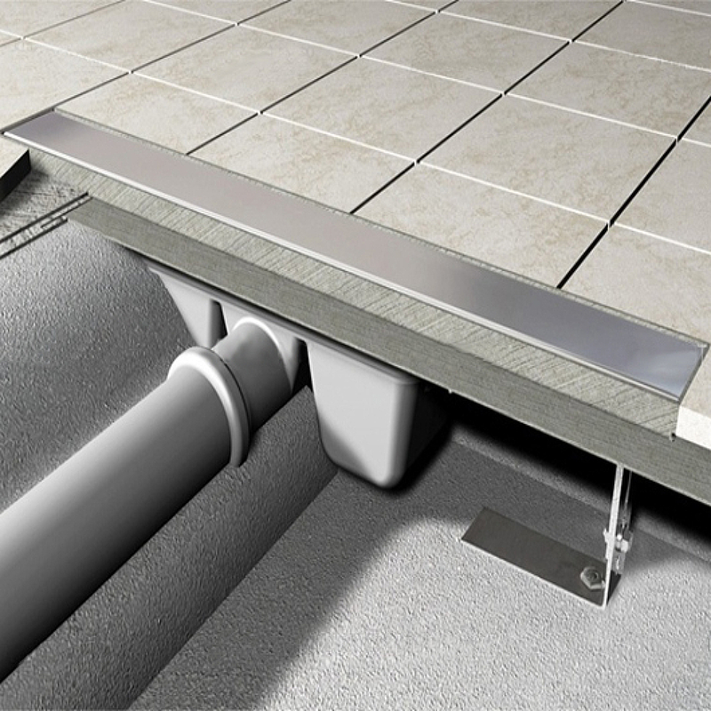 Водоотводящий желоб с сифоном Монтажный набор: шуруп Ø6×50 – 2 шт., дюбель Ø10 – 2 шт. Самоклеящиеся гидроизоляционные ленты Защитная пленка для воротника желоба и впускного отверстия сифона Монтажный вкладыш для защиты лотка желоба Монтажный набор для крепления регулируемых ножек: шуруп M6×12 – 2 шт |