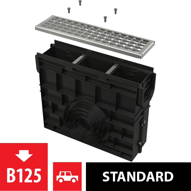 Корпус дренажного канала Оцинкованная решетка – класс нагрузки B125 Болты для крепления решетки в канале – 4 шт. |