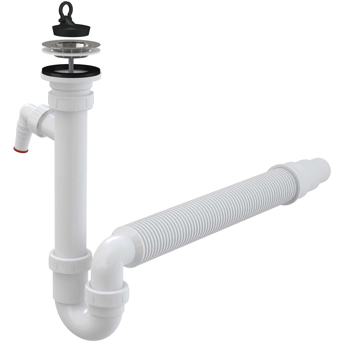 Корпус сифона со штуцером. Гофрированный гибкий шланг. Пробка из ПВХ. Сливная решетка из нержавеющей стали. |