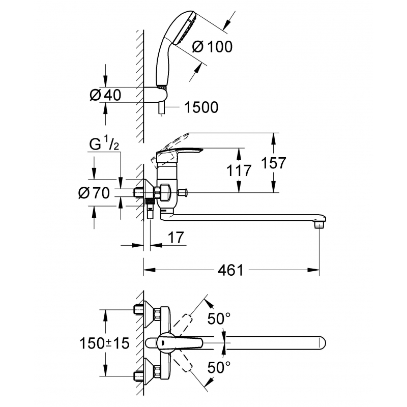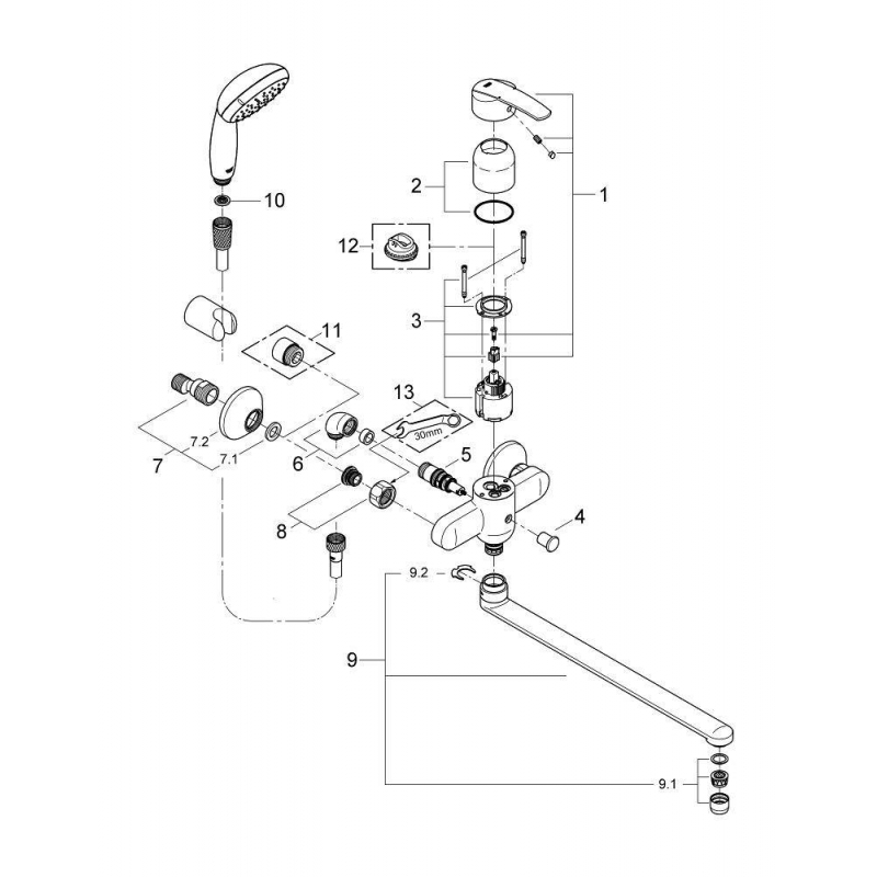Держатель ручного душа (28605000 GROHE);душ ручной (27597000 GROHE);душевой шланг (28151000 GROHE);ограничитель расхода воды; |