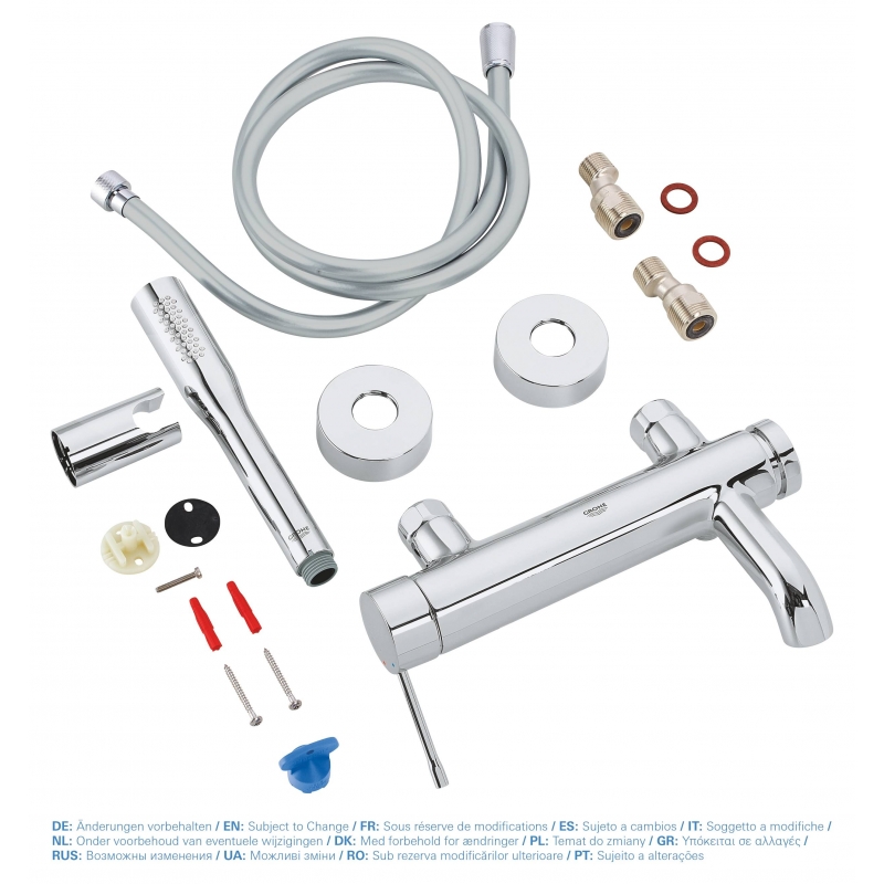 Встроенный обратный клапан для защиты от обратного потока; держатель ручного душа; душ ручной (27400000 GROHE);душевой шланг (28364000 GROHE);ограничитель расхода воды; ограничитель температуры воды; |
