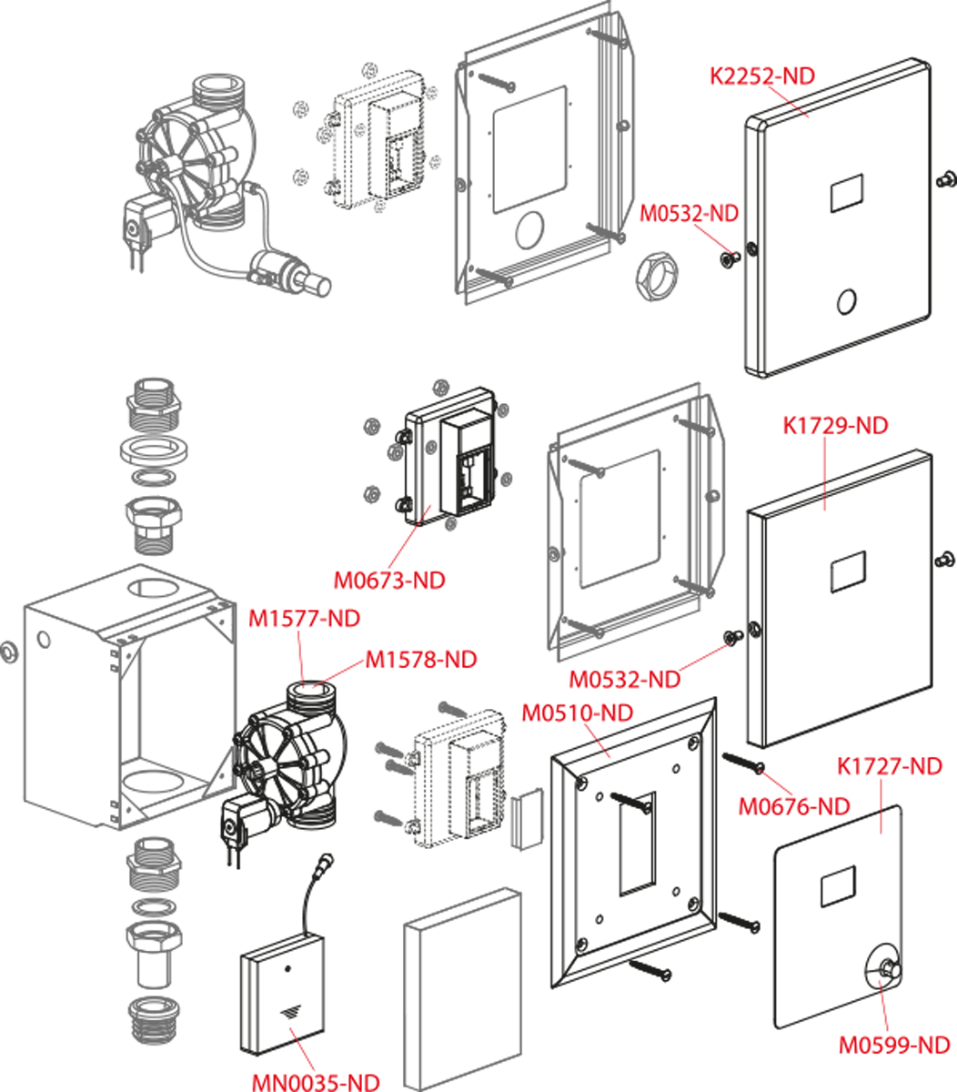 Коробка сенсора из нержавеющей стали; Фитинговое соединение с электромагнитным клапаном; Кнопка с возможностью мануального смыва и скрытым креплением; Окантовочная рамка из нержавеющей стали; Шаблон облицовки; Водонепроницаемый разъем для подключения питания; Инфракрасный датчик, регулируемый через USB-порт; Монтажный комплект для крепления защитной рамки: болт M4×10 – 2 шт.; Монтажный комплект для крепления коробки к раме: шуруп 3,5×16 – 4 шт.; Резьбовое соединение G1"; Батарейный блок для 4-х батареек типа АА 1,5 В. |