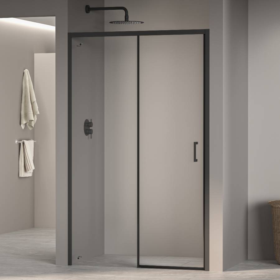 Прозрачное стекло добавляет простоты и элегантности, а черный цвет профиля подчеркивает стиль и современность двери. Общая высота составляет 1950 миллиметров, что позволяет установить дверь в большинство ванных комнат.