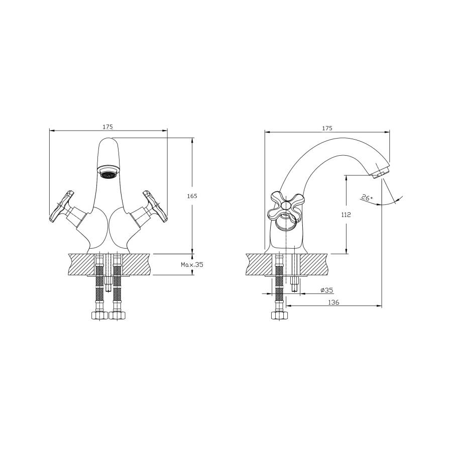 В смеситель установлены кран-буксы (RSH502) с керамическими пластинами. Высота смесителя 165 мм. Излив литой неповоротный 136 мм. Высота излива до аэратора 112 мм. Аэратор изготовлен из пластика с нержавеющим корпусом, угол наклона - 26 гр.