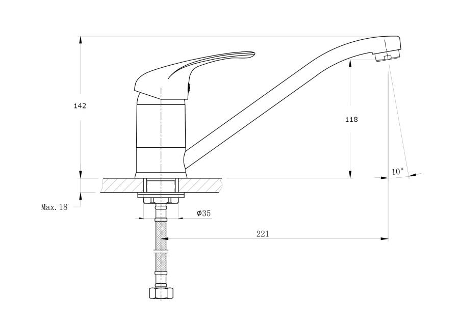 В смеситель установлен картридж D-40 (RSH202) с керамическими пластинами. Излив поворотный 360гр, 221мм. Высота излива до аэратора 115 мм. Аэратор изготовлен из пластика с нержавеющим корпусом, угол наклона аэратора- 10 гр.