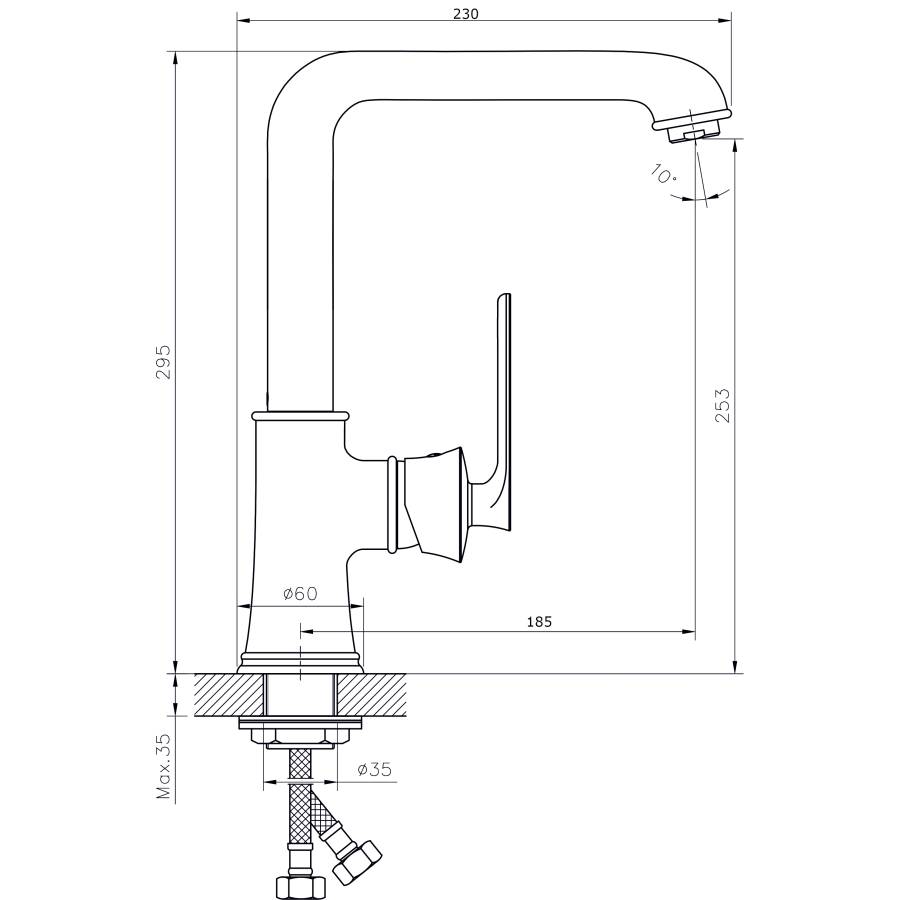 В смеситель установлен картридж D-35 с керамическими пластинами. Высота смесителя 295 мм. Излив поворотный, 185 мм. Высота излива до аэратора 253 мм. Аэратор изготовлен из пластика с нержавеющим корпусом, угол наклона аэратора- 10 гр.