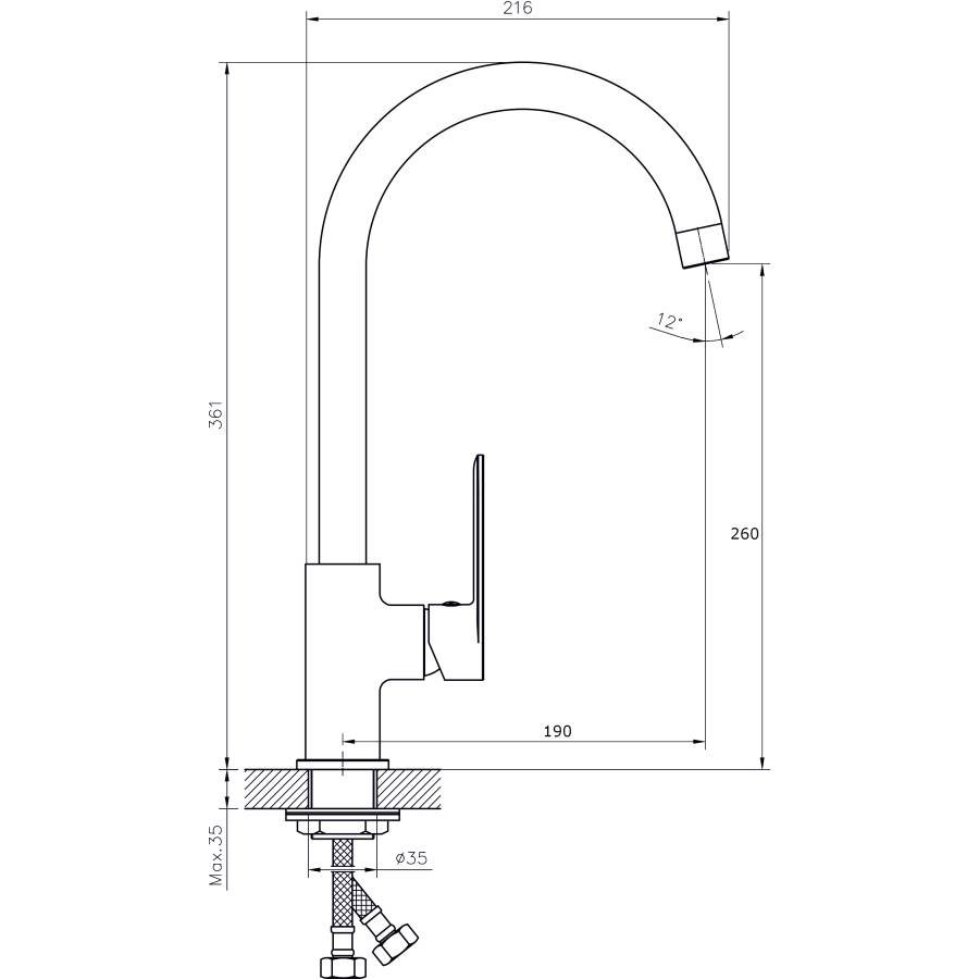 В смеситель установлен картридж D-30 с керамическими пластинами. Высота смесителя 361 мм. Излив поворотный, 190 мм. Высота излива до аэратора 260 мм. Аэратор изготовлен из пластика с нержавеющим корпусом, угол наклона аэратора - 12 гр.