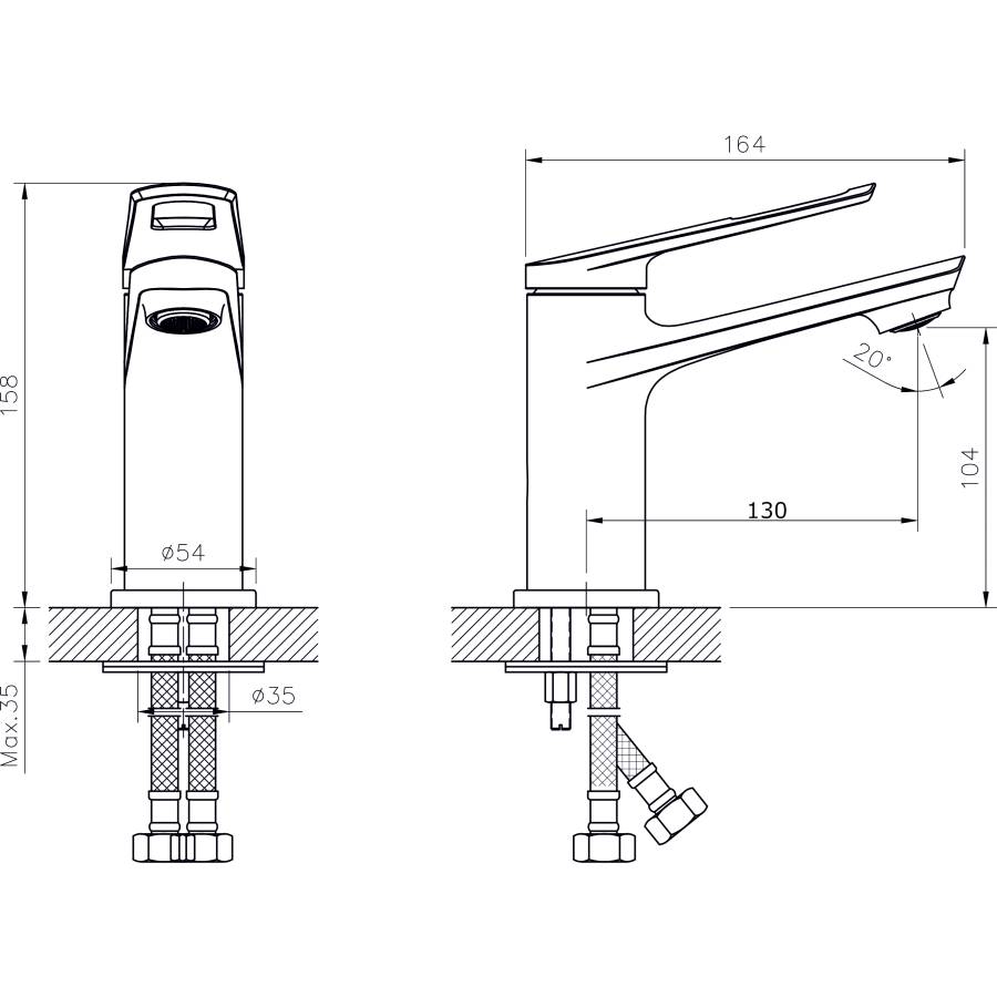 В смеситель установлен картридж D-35 с керамическими пластинами. Высота смесителя 158 мм. Излив литой, неповоротный, 130 мм. Высота излива до аэратора 104 мм. Аэратор изготовлен из пластика с нержавеющим корпусом, угол наклона аэратора- 12 гр.