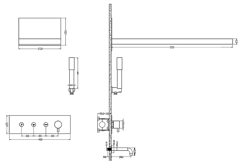 Смеситель (внешняя и внутренняя часть). Излив. Верхний душ. Ручной душ. |