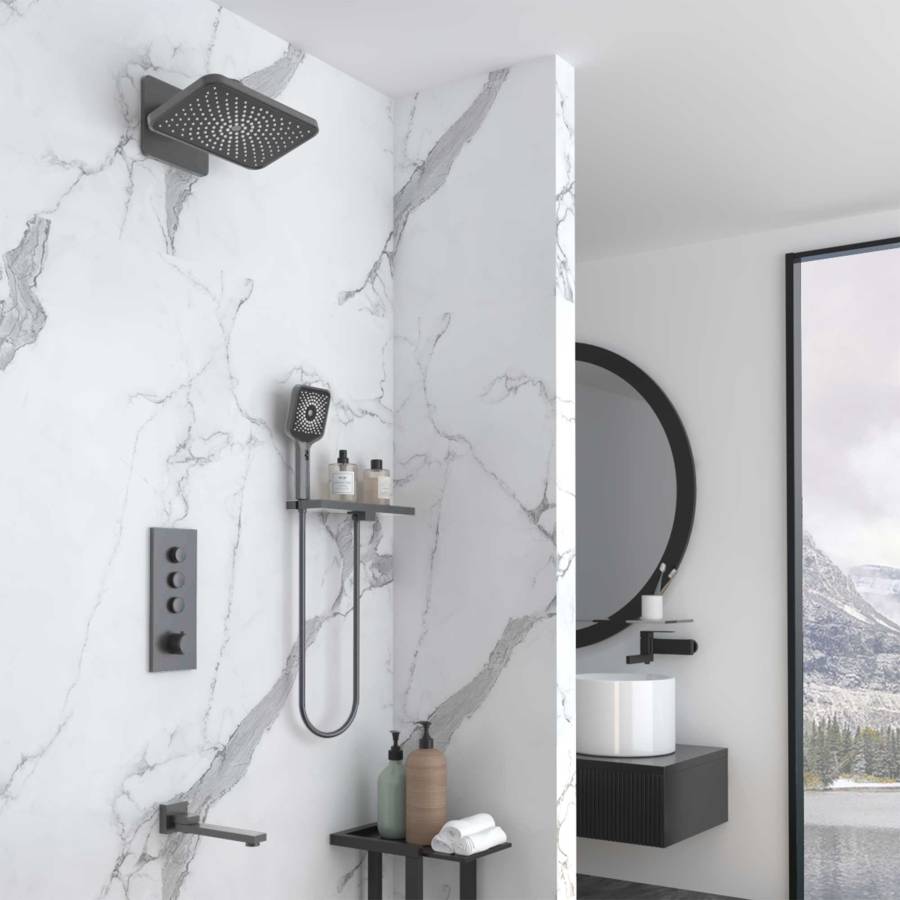 Верхний душ Inspire VSHD-3I4CGM, вороненая сталь Полка с держателем для душа VSRC-41GM, вороненая сталь Ручной душ с шлангом Inspire VSHN-3I4HGM, вороненая сталь Встраиваемый смеситель для душа VSCV-433TGM трехфункциональный, термостатический, вороненая сталь Излив VSWS-41MB, черный |