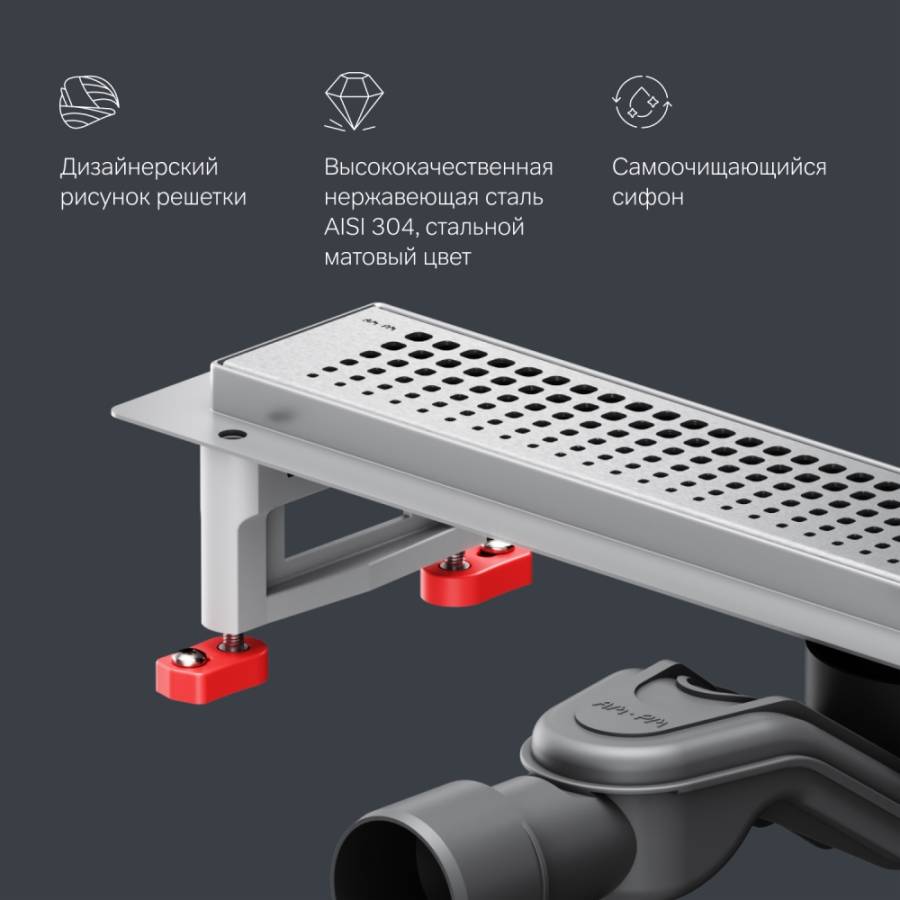 Продукт обладает низкой высотой монтажа и возможностью регулировки что предполагает экономию бюджета при заливке пола. Нержавеющая сталь со специальным антикоррозийным защитным покрытием нанесенная методом кислотной пассивации. Выход разработан на два диаметра: 40 и 50 мм которые выбираются в процессе монтажа._x000D_