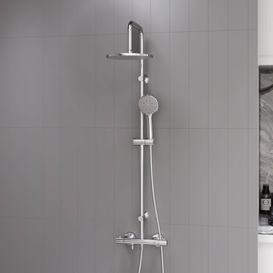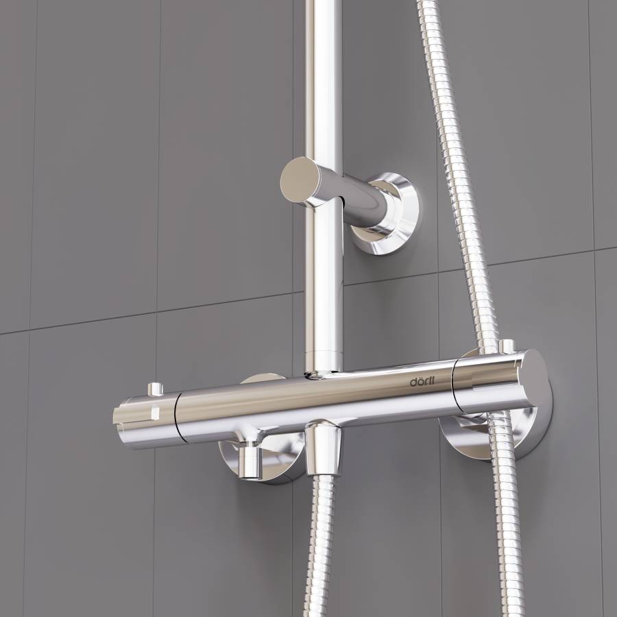 Термостат душевых систем в элегантных современных размерах предотвратит от ожогов даже при внезапном отключении холодной воды. Встроенный стопор безопасности на 38 градусов. _x000D_